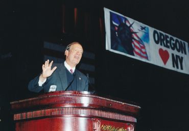"Oregonians of a previous age, they walked 3,000 miles to go there, despite the hardships and some fear that our forebears had. Oregonians of our time showed courage to board airplanes at a time of severe restriction and insecurity and showed with their wallets and their shoe leather that hearts were one with New Yorkers. This was a bright, shining moment for Oregon."
